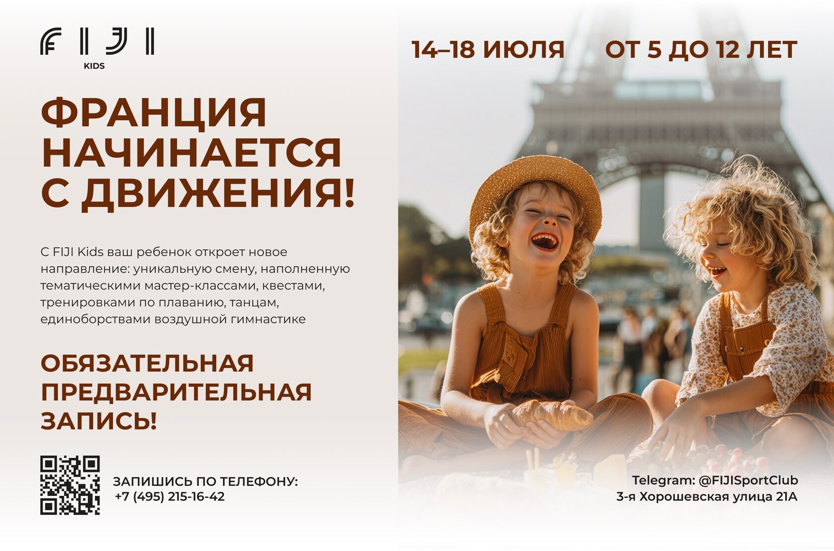 С 14 по 18 июля FIJI Kids открывает новое направление: Франция. Это путешествие в культуру, эстетику и игру. Каждый день — насыщенный маршрут: тематические мастер-классы, квесты, тренировки по плаванию, танцам, единоборствам и воздушной гимнастике. В атмосфере одной из самых красивых стран мира дети учатся быть свободными, внимательными, чувствующими.